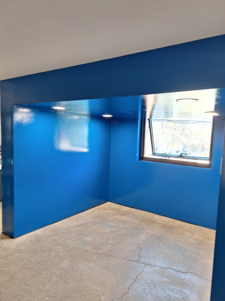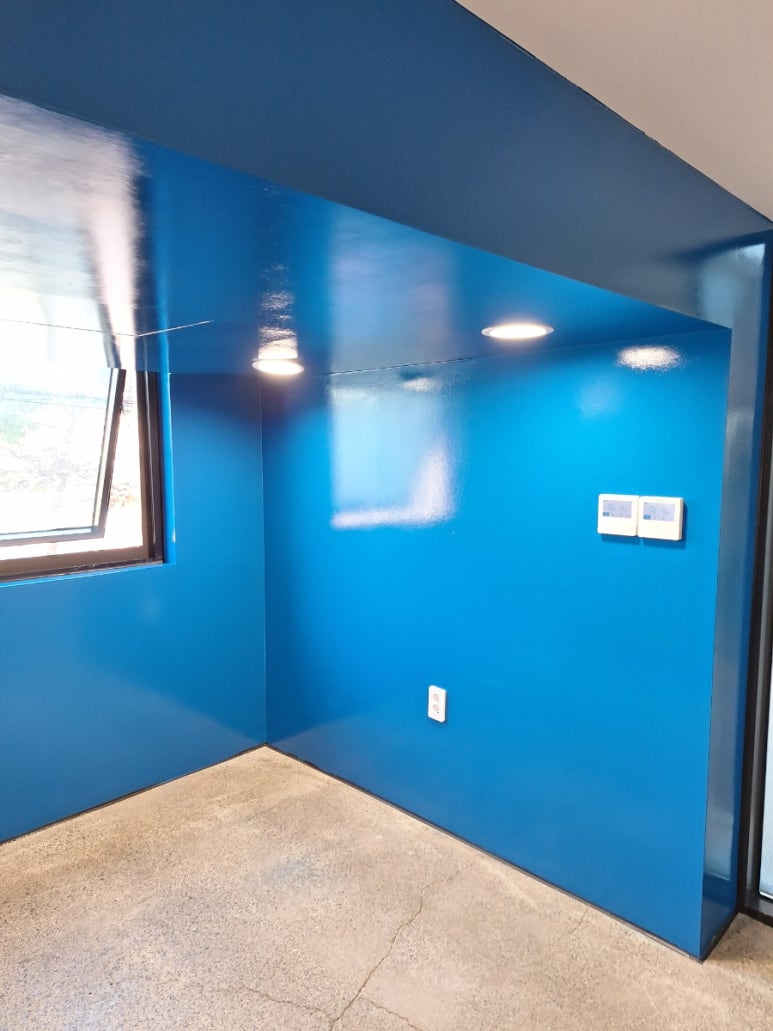 현장에 들어서면 가장 먼저 눈에 들어오는 것은 전체적으로 통일된 블루 컬러입니다. 이 색상은 단순히 시각적인 포인트를 주는 것을 넘어, 공간에 안정감과 집중도를 부여하는 역할을 합니다. 기존에는 다소 밋밋하고 사용감이 느껴지는 벽면이었지만, 청아페인트 대구수성구 도색작업 이후에는 훨씬 세련되고 정돈된 느낌으로 변화했습니다.
